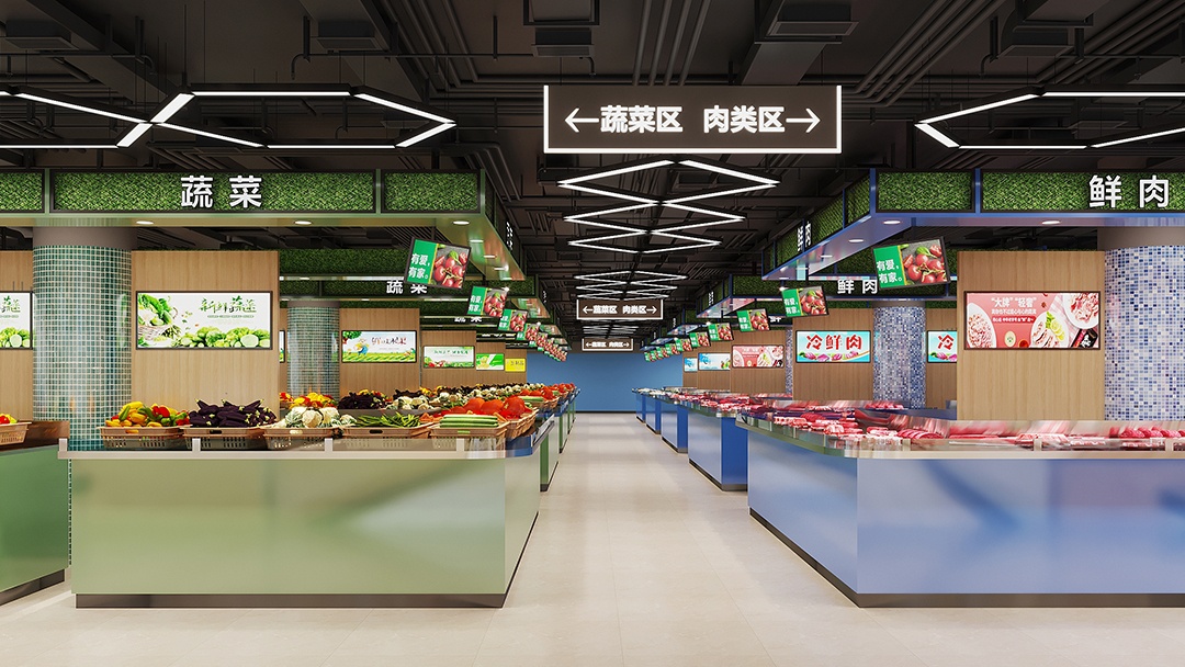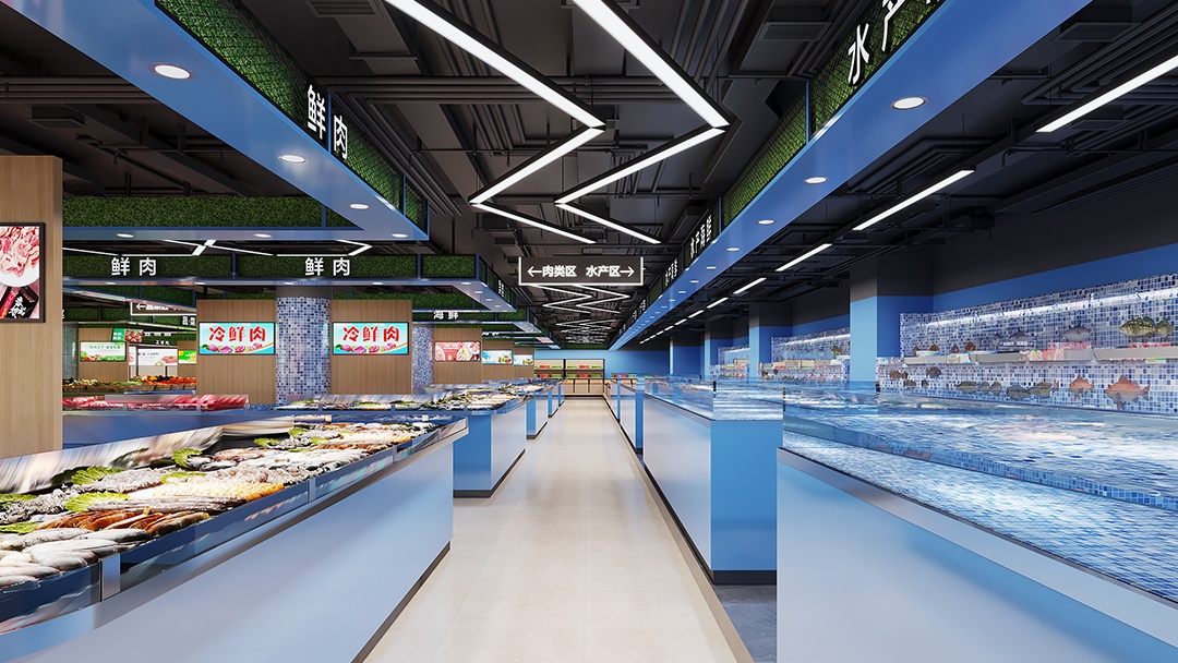 杭州生鮮超市裝修設(shè)計(jì),巧妙運(yùn)用色彩分區(qū),以藍(lán)色勾勒生鮮區(qū),綠色暈染蔬果區(qū),打造出別具一格的購物空間。踏入生鮮區(qū),靜謐而深邃的藍(lán)色調(diào)撲面而來,營造出海洋般的清涼氛圍。冷柜、展示架皆以藍(lán)色為主,與各類鮮活的海鮮、肉類相互映襯,凸顯品質(zhì)與新鮮。移步蔬果區(qū),清新的綠色瞬間讓人心曠神怡。生機(jī)勃勃的綠植裝飾與翠綠的蔬果相得益彰,仿佛置身于田園之中。合理的陳列布局,讓每一顆果實(shí)、每一把蔬菜都能盡情展現(xiàn)其飽滿姿態(tài)。藍(lán)綠交織的設(shè)計(jì),不僅為顧客帶來視覺上的享受,更引導(dǎo)著購物動(dòng)線。在這里,每一次挑選都是與自然的親密對(duì)話,開啟一場鮮活、健康的購物之旅。