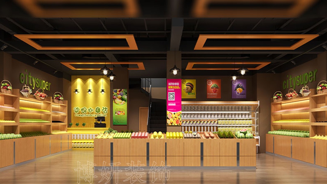 杭州連鎖水果超市裝修設(shè)計,走進(jìn)店內(nèi),裸頂噴黑的處理打破常規(guī),營造出工業(yè)風(fēng)與時尚感交織的獨(dú)特氛圍,讓空間更具縱深感與神秘氣息。橙黃色作為點(diǎn)綴色驚艷亮相,從招牌到店內(nèi)的裝飾線條,靈動的橙黃如跳躍的音符,瞬間抓住顧客目光,傳遞出水果的鮮活與熱情,激發(fā)人們的購買欲望。原木展示貨架,是店內(nèi)一大亮點(diǎn),天然的木紋質(zhì)感,給人質(zhì)樸、溫暖的感受。其合理的分區(qū)設(shè)計,讓各類水果有序陳列,方便顧客挑選。橙黃與原木、黑頂相互映襯,既有時尚的沖擊力,又不失自然的親和力。在這里,顧客能盡情享受一場視覺與味覺的雙重盛宴。