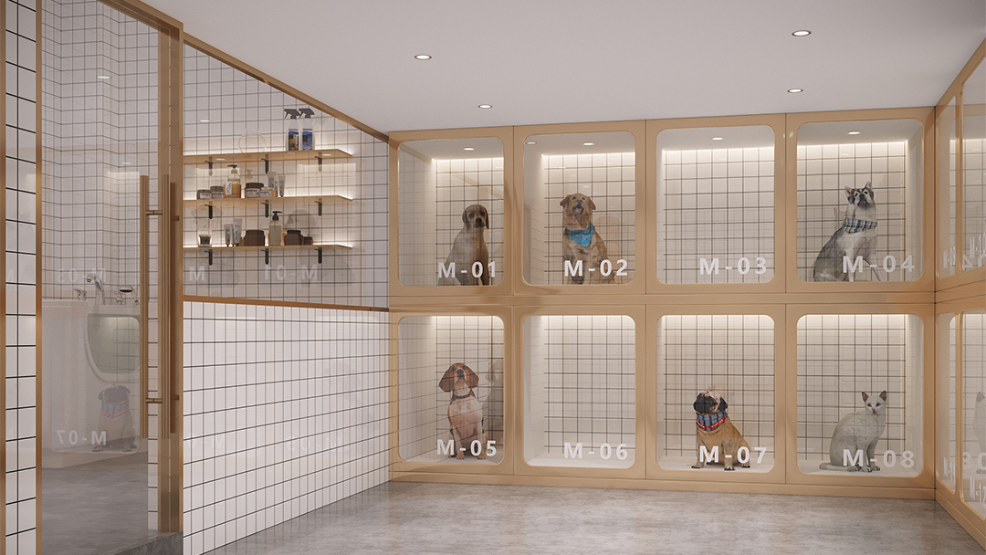 采用“隱形收納+模塊化家具”系統(tǒng),將美容臺、寄養(yǎng)艙、商品陳列區(qū)整合為可靈活調(diào)整的單元。例如犬類護理區(qū)配備可升降不銹鋼操作臺與隱藏式吹水機支架,貓柜則采用雙層結(jié)構(gòu)搭配磁吸式食盆設計,最大化利用有限空間。 - 自然材質(zhì)與智能科技應用