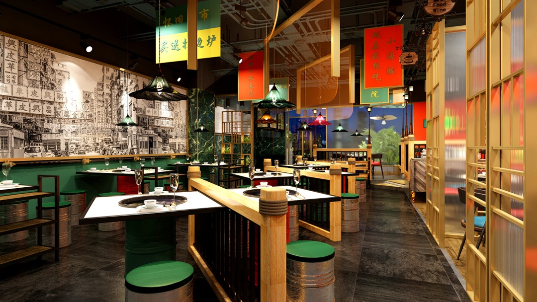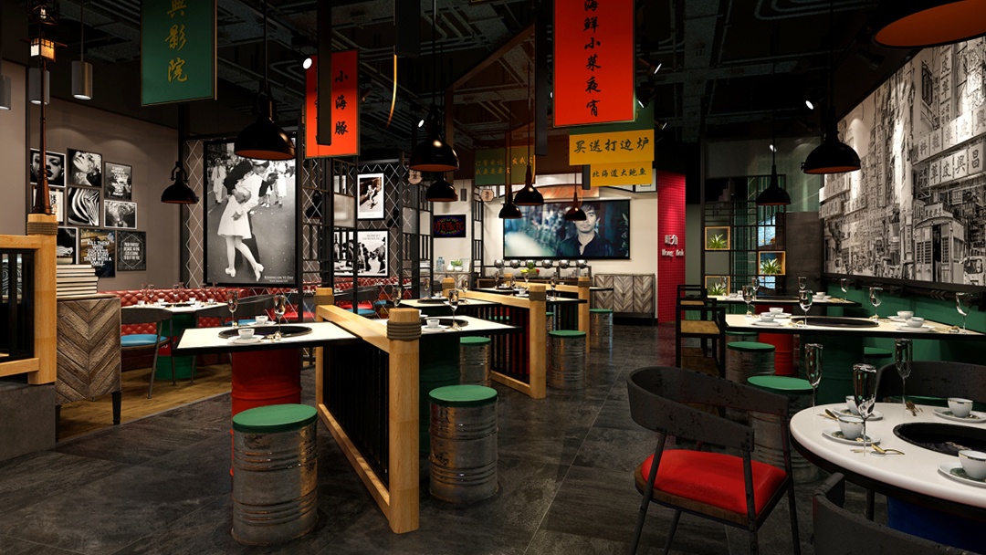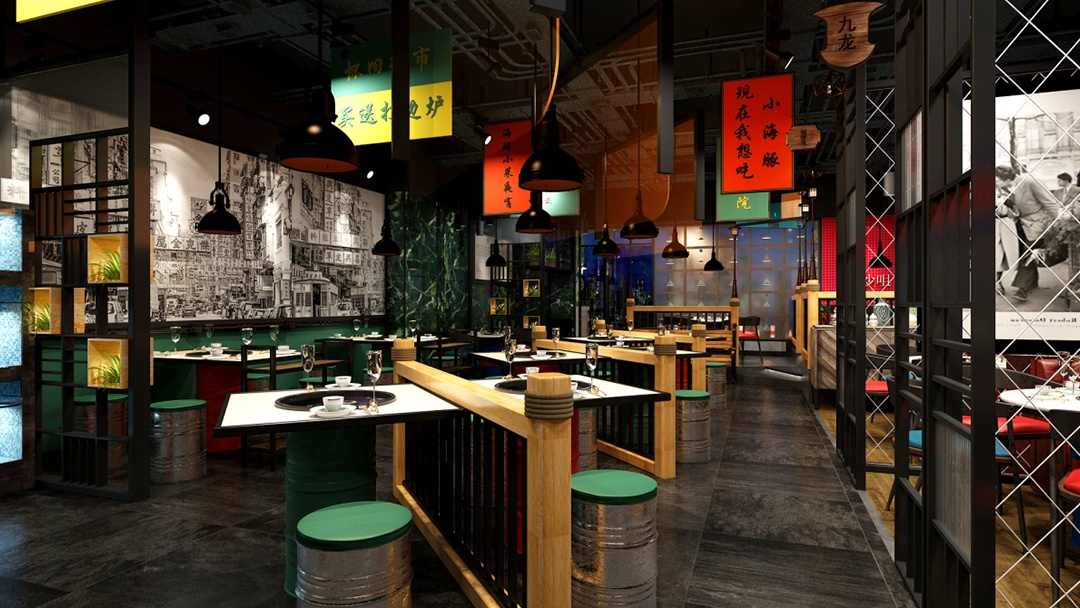 杭州懷舊風(fēng)火鍋店裝修設(shè)計中,為了營造出簡約、隨意、懷舊,且具有煙火氣息的用餐環(huán)境。同時,明確傳達出“價格平民”的訊息,吸引喜愛這種風(fēng)格的顧客,前來體驗。我們在墻面上,張貼具有年代感的大字報和老照, 展示過去市井生活的場景,如老街巷、老火鍋店等,喚起顧客的懷舊情感。并利用廢舊的大鐵桶,改造成獨特的椅子,既體現(xiàn)了環(huán)保理念,又增加了空間的工業(yè)風(fēng)格元素。頂面,巧妙懸掛手寫主打菜名,和優(yōu)惠活動牌子。既吸引顧客注意,又能增添一絲文化氣息。