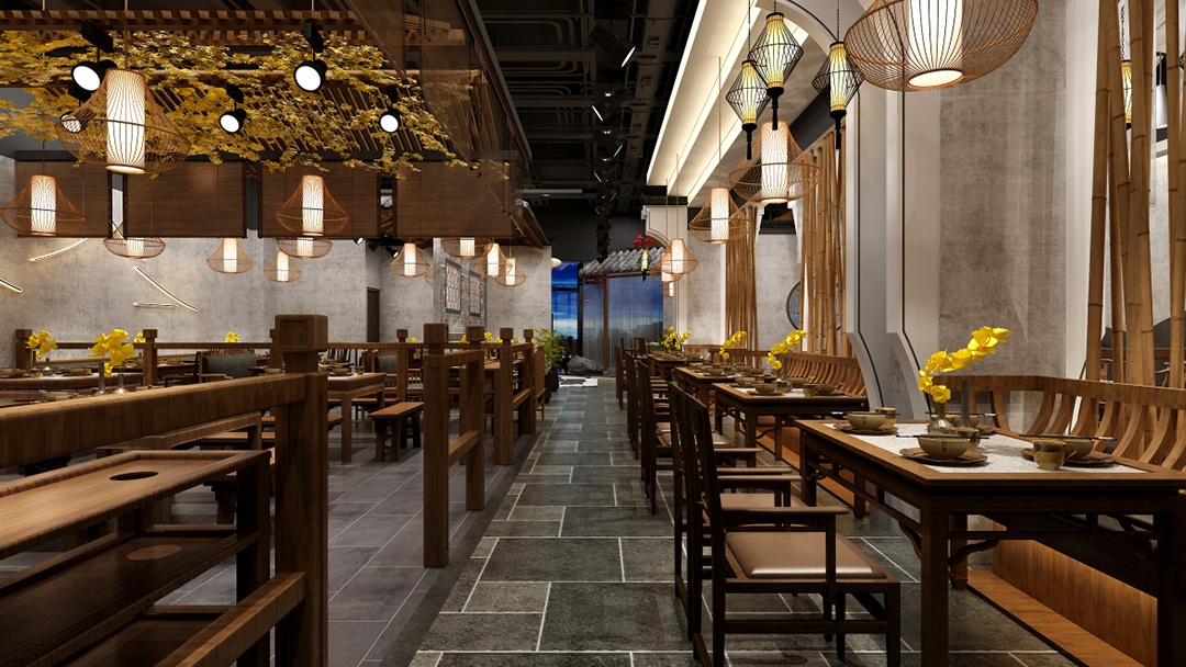 我們根據(jù)餐廳所在地域文化,選擇具有地域特色的材料。包括青磚、瓦片、竹編、石雕等,來強(qiáng)化地域感。
