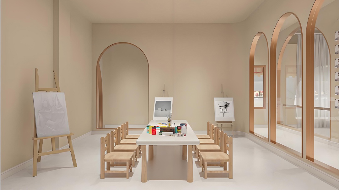 杭州藝培機構(gòu)裝修設計,本案以“藝術(shù)發(fā)生器”為核心理念,打破傳統(tǒng)教室邊界。空間采用可移動展墻與模塊化工作臺,支持繪畫、手作、多媒體等課程的快速場景轉(zhuǎn)換。頂部軌道系統(tǒng)懸掛各類創(chuàng)作工具與作品,墻面保留部分粗礪肌理供即興涂鴉。自然光經(jīng)北向高窗漫射入內(nèi),搭配專業(yè)顯色照明系統(tǒng)。中央設置“靈感共享艙”——階梯式開放展臺結(jié)合數(shù)字投影墻,鼓勵作品展示與跨界交流,營造自由且激發(fā)創(chuàng)造力的藝術(shù)孵化環(huán)境。