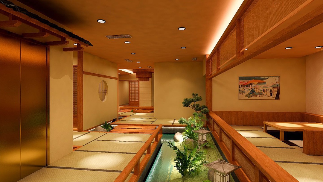 材質(zhì)與氛圍:選用原木、竹編、素色涂料等天然材料,搭配暖黃燈光與庭院枯山水造景,營造靜謐雅致的用餐環(huán)境。
