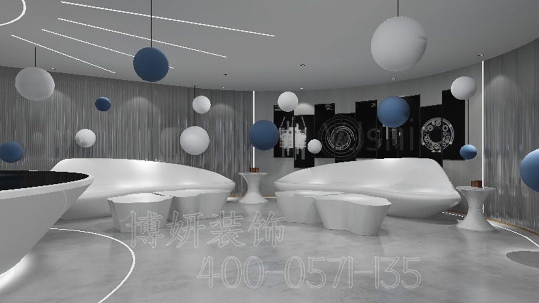 藍(lán)色,作為點(diǎn)綴色巧妙融入,或是在展示屏幕的邊框,或是在休息區(qū)的軟裝,為冷靜的空間增添靈動(dòng)與科技感。線性燈帶,沿著墻面、天花板蜿蜒伸展,如流動(dòng)的光河,不僅勾勒出空間的輪廓,更營(yíng)造出未來(lái)感十足的氛圍。