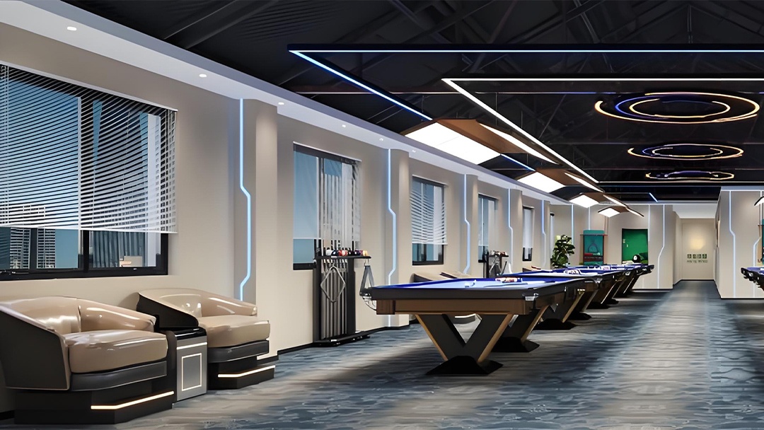 針對臺球廳需求,博妍從三大維度構建解決方案:空間布局上,嚴格遵循行業(yè)標準,確保球桌間距1.5米以上、主通道寬度合理,實現(xiàn)比賽區(qū)、休息區(qū)、水吧等功能分區(qū)的科學動線分離;環(huán)境營造方面,采用4000K中性光LED無影燈系統(tǒng),搭配深色吸音墻面與PVC防滑地板,通過聲學優(yōu)化將噪音控制在55分貝以下;增值服務區(qū)則整合智能預約系統(tǒng)、自助結算終端及會員管理平臺,提升運營效率。