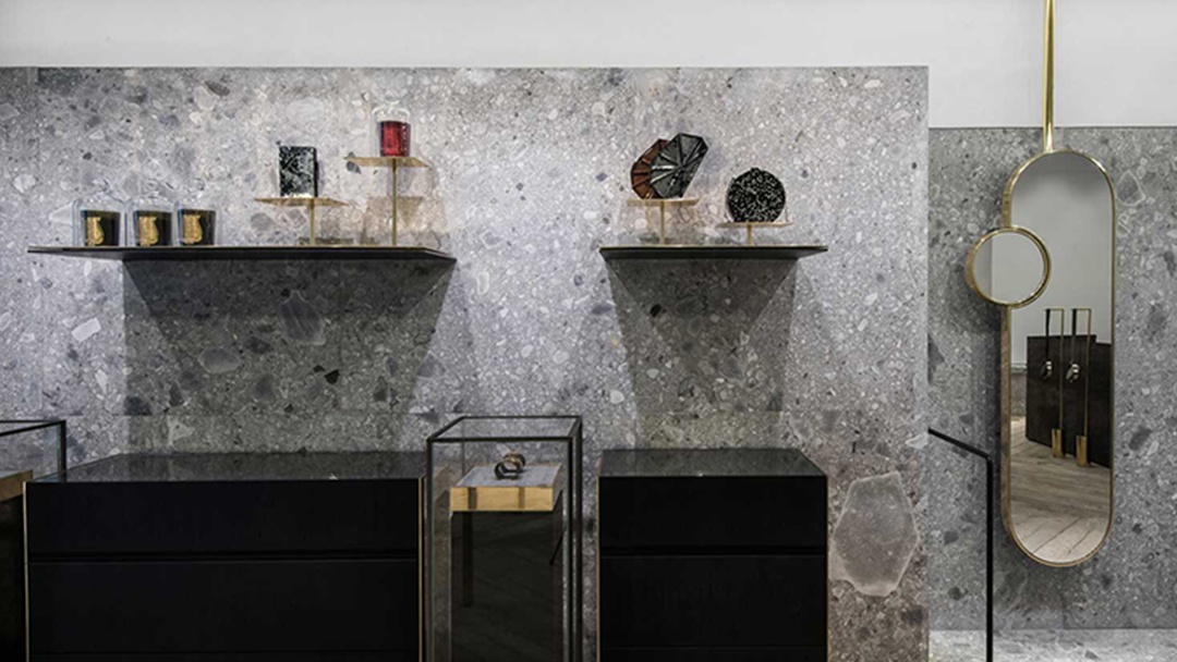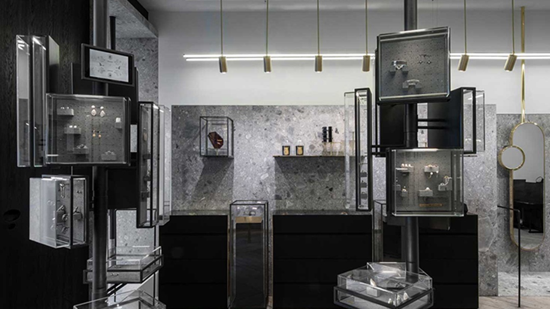 杭州奢侈品珠寶店裝修設(shè)計(jì),以高級(jí)灰為基調(diào),勾勒出無與倫比的奢華意境。