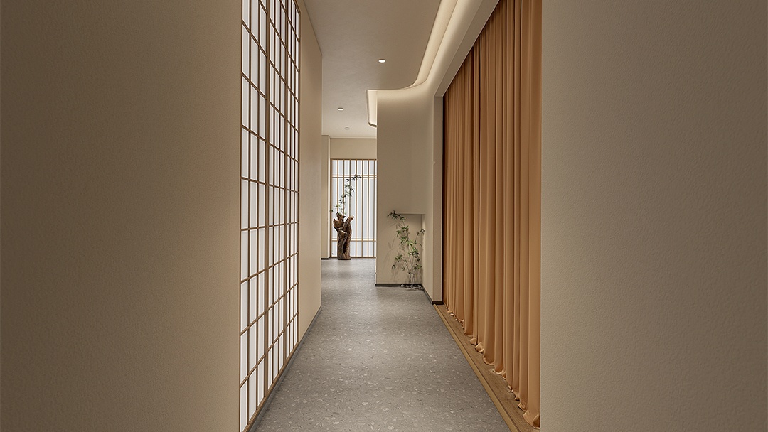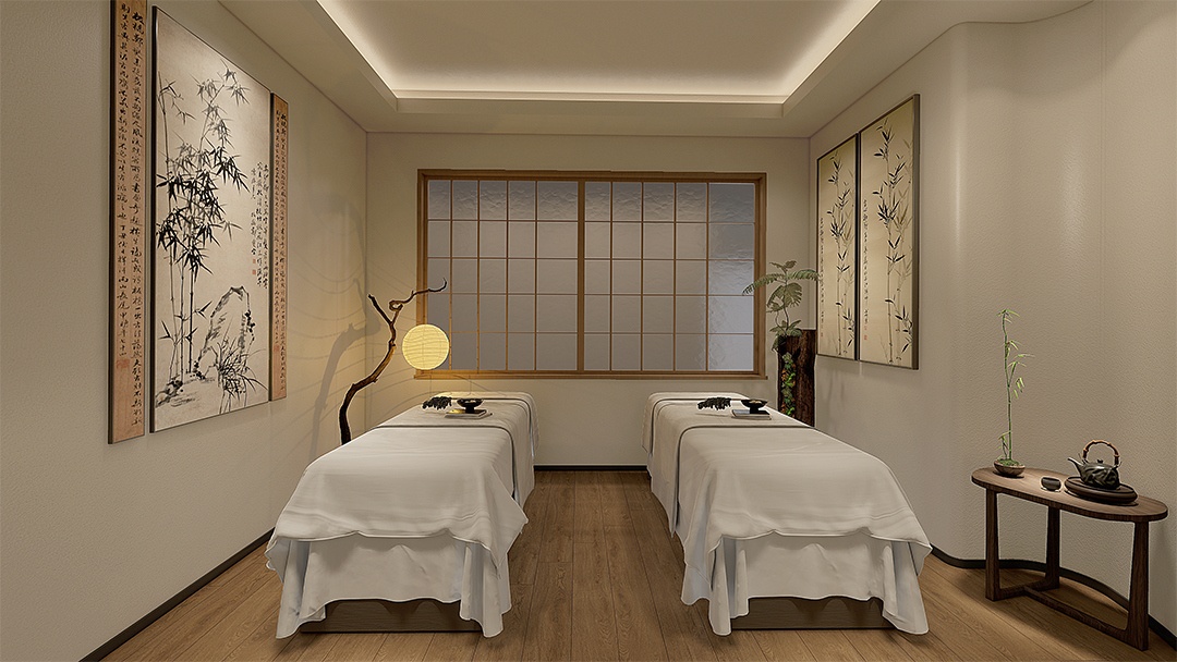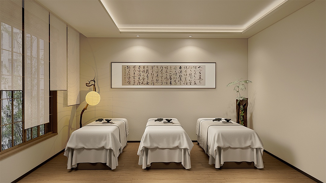 杭州新中式推拿館裝修設(shè)計,融合東方美學與現(xiàn)代舒適需求??臻g以淺灰墻面與原木格柵構(gòu)筑雅致基底,理療區(qū)采用可升降中式榻榻米床榻,搭配鏤空花窗隔斷與可調(diào)角度射燈。墻面嵌入動態(tài)山水紗幔投影,背景音效模擬溪流鳥鳴。草藥熏蒸區(qū)以銅制云霧裝置呈現(xiàn)可視化蒸汽理療,整體以麻織品、竹編與溫石材質(zhì)點綴,營造身心同息的沉浸式調(diào)理場景。